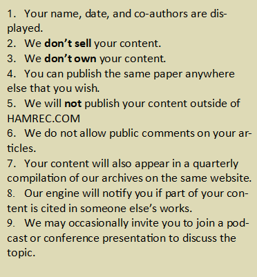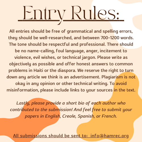 If you want the HAMREC editorial board to publish your articles, remember that they should be free of grammatical and spelling errors, well-researched, and between 700–1200 words. You can submit your papers in English, Creole, Spanish, or French. The tone should be respectful and professional. There should be no name-calling, foul language, anger, incitement to violence, evil wishes, or technical jargon. Write as objectively as possible, and offer honest answers to common problems in Haiti or the diaspora. We reserve the right to turn down any article we think is an advertisement. Plagiarism is not okay in any personal opinion or other technical writing. To avoid misinformation, please include links to your sources in the text. Please provide a short bio of each author who contributed to the piece.